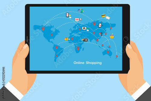 Online Shopping Ecosystem indicating fast internet connectivity, symbolizes mobile shopping, vector flat graphic illustration.