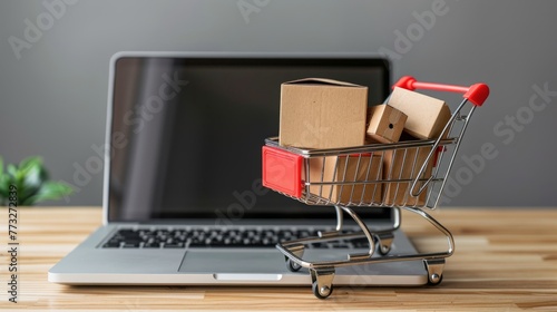 Online shopping, shopping cart and computer purchase, e-commerce concept