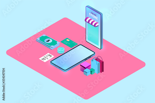 Online shopping with mobile,Isometric objects,vecter illustration for graphic design website or banner