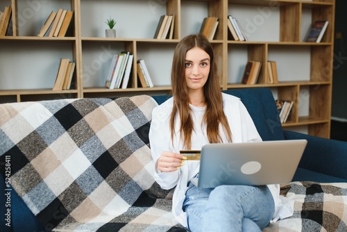 Online Store. Happy girl doing shopping via internet using laptop and credit card, sitting on couch, copyspace