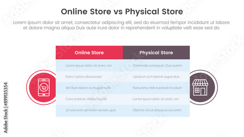 online store vs brick mortar or physical store comparison concept for infographic template banner with big table box and circle shape badge with two point list information