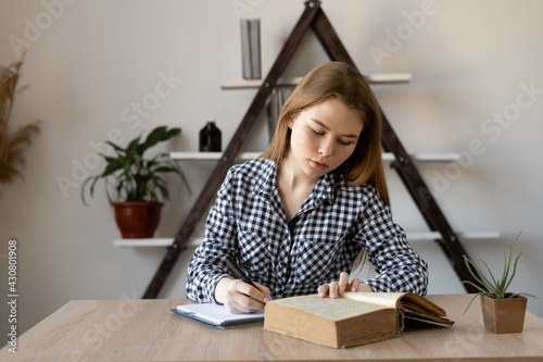 Online student girl in a lesson with a remote tutor takes notes and studies without looking at the camera. Milenial is a freelancer on the Internet.