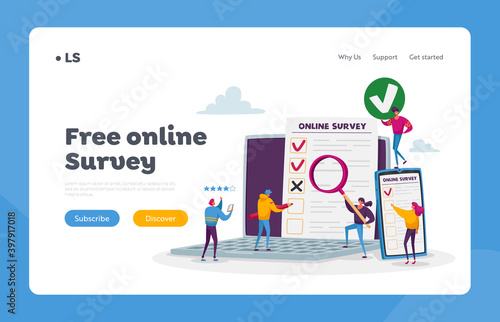 Online Survey Landing Page Template. Tiny Characters Filling Digital Form on Huge Laptop and Smartphone Application