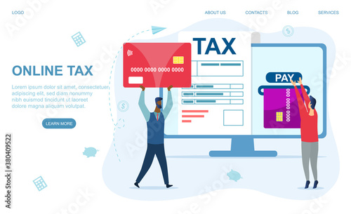Online tax payment concept. Tiny people paying taxes using a special form on the website of the tax service. Flat abstract colorful vector illustration
