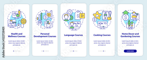 Online tutorials ideas onboarding mobile app screen. Walkthrough 5 steps editable graphic instructions with linear concepts. UI, UX, GUI template. Myriad Pro-Bold, Regular fonts used