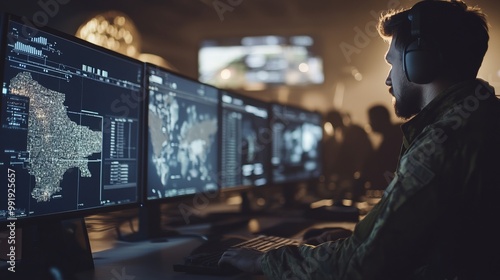 Online video surveillance security systems. Military man sitting at video surveillance and camera screen, security monitoring, HUD user interface.