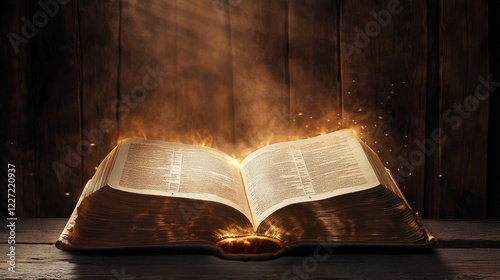 Open Antique Bible With Glowing Pages and Mystical Light, Set Against a Rustic Wooden Background