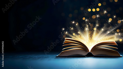 Open Antique Book With Golden Sparkles Glowing In The Dark On A Blue Surface