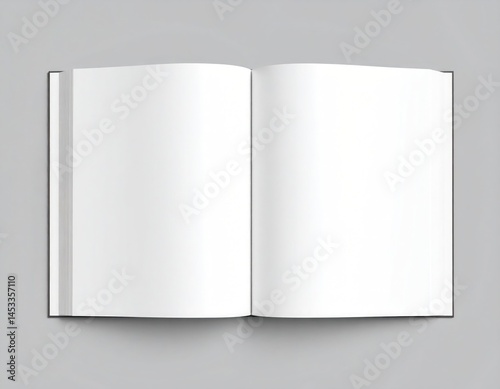 Open blank book mockup on gray background, white pages, top view, empty notebook, clean layout, minimalist design, 3D rendering, publication template