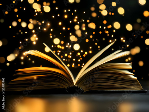 Open Book Emits Magical Golden Light Sparkles on a Dark Background Gently