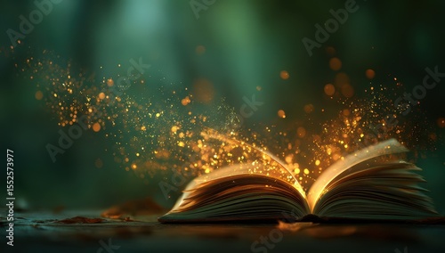 Open book, glowing particles, mystical forest