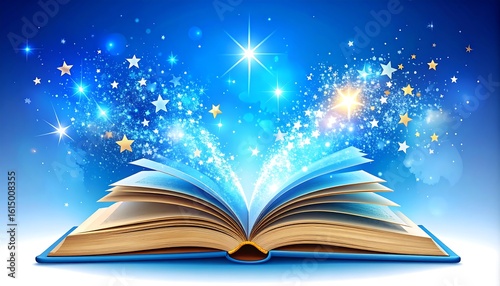 Open book glowing with magical stars and light