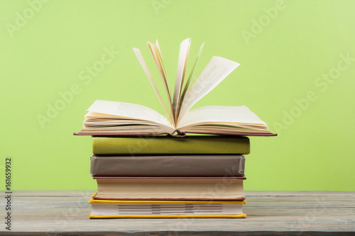 Open book, hardback books on wooden table. Education background. Back to school. Copy space for text.