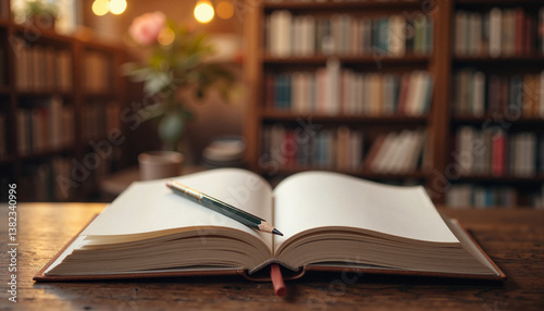 Open book mockup with pencil in cozy library, warm evening ambiance