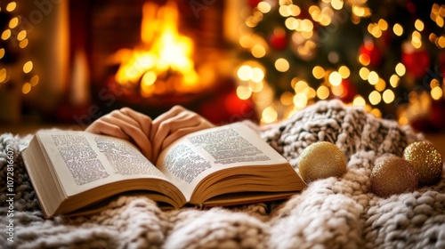 Open Book on a Cozy Blanket with Christmas Ornaments and Fireplace in the Background