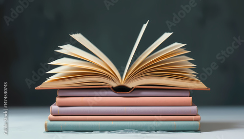 Open book on a stack of colorful books, inviting readers to explore the world of knowledge and imagination.