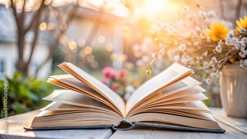 Open book on a white table with flowers, spring sunlight
