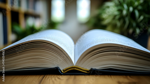 Open book on a wooden table with plants.