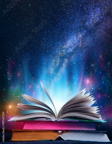 Open book on stacked books under starry sky galaxy dreamlike