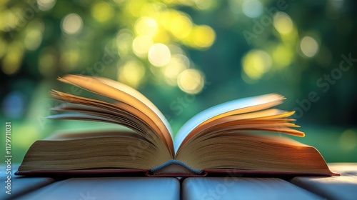 Open book on wooden table with blurred green background emphasizing education and knowledge concept in a serene outdoor setting.