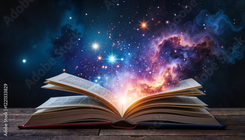 Open book releasing galaxies in cosmic glow, celebrating imagination