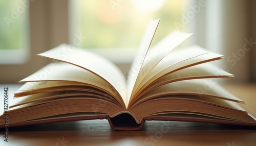 Open book resting on table. Pages spread widely. Light shines on open pages. Book likely hardback collectible. Reading concept. Education concept. Knowledge. Learning. Home library. Reading hobby.
