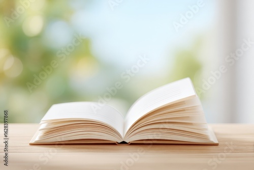 Open book rests on wooden surface, soft sunlight illuminating pa