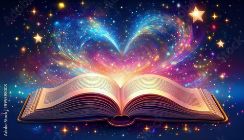 Open book spreading magic light with sparkling stars background, perfect for fantasy, imagination and creative projects
