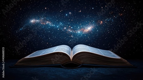 Open book under starry sky filled with galaxy and knowledge concept. An open book against a starry cosmic background.