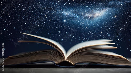 Open book under starry sky filled with galaxy and knowledge concept. An open book under a starry sky symbolizes knowledge and dreams.