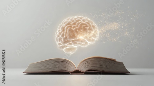 Open book with a glowing AI-generated brain floating out, symbolizing the advancement of education through technology, on a minimal white background.