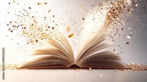 Open book with fluttering pages surrounded by sparkling golden particles on a soft white background, creating a magical and enchanting atmosphere.