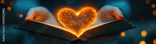 Open book with glowing heart shape, symbolizing love and knowledge.
