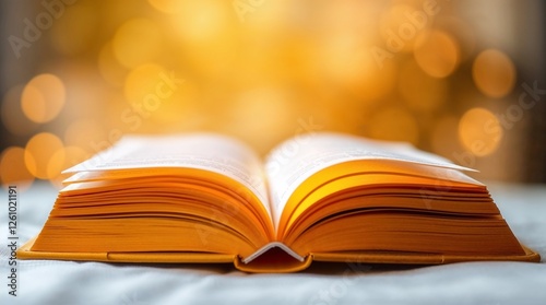 Open book with glowing pages, magical atmosphere, reading material, soft background, copy space