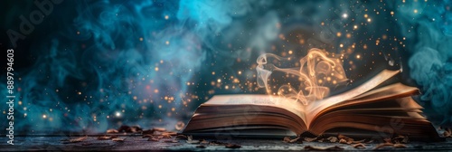 Open book with glowing pages, magical light particles, sparkles and smoke, misty light effects , enchanting atmosphere, abstract background