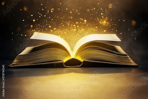 open book with golden light emanating from its pages placed on matte surface with soft reflections
