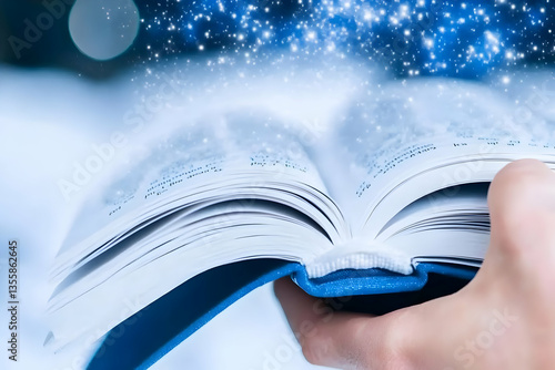 Open Book With Mystical Light and Sparkles Emanating in a Soft Blue and White Tone With Hand Holding the Book Symbolizing Knowledge and Imagination and a Dreamlike Atmosphere