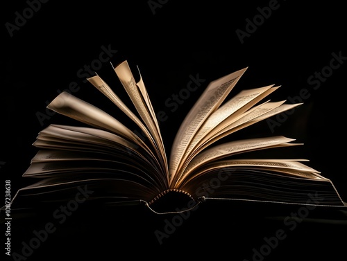 open book with pages fluttering in mid-air, illuminated by soft beams of light, against a dark backdrop symbolizing knowledge and inspiration