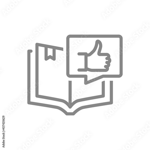 Open book with thumb up in speech bubble line icon. Best book, good reader review symbol