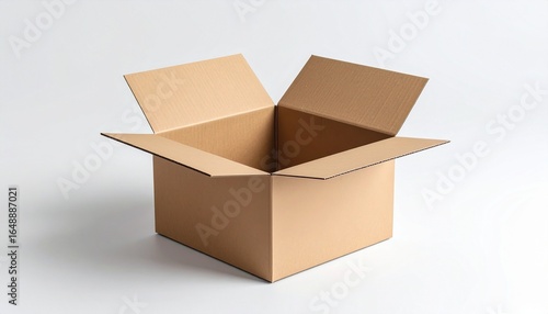 "Open cardboard box with extended flaps, empty and centered on a plain white background, emphasizing packaging simplicity and utility."