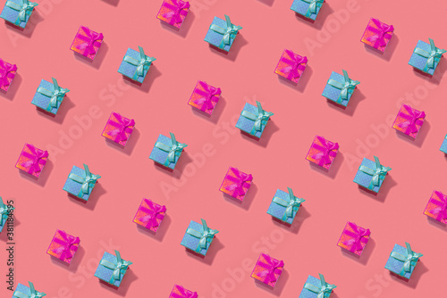 Open composition of blue and red Christmas gift boxes on pink in diagonal. New Year concept.