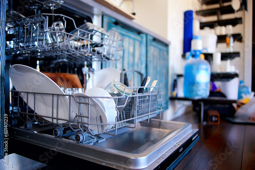 open dishwasher in the kitchen, dishes inside, clean plates in the kitchen lifestyle view