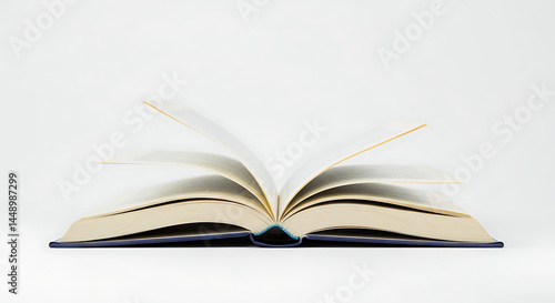 Open hardcover book with slightly curled pages on white background, minimalistic literature concept