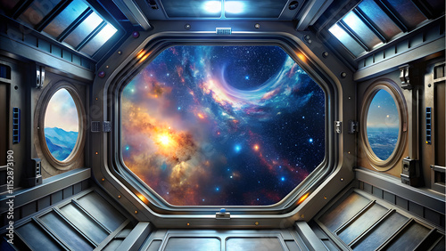 Open Hatch of Spacecraft with Starry Sky View. Perfect for: Space-Themed Parties, Sci-Fi Conventions, Inspirational Events