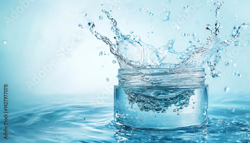 Open jar of cosmetic cream in transparent splas