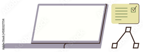 Open laptop with blank screen alongside a flowchart diagram connected to a yellow task checklist. Ideal for productivity, organization, task planning, workflow management, digital tools, project