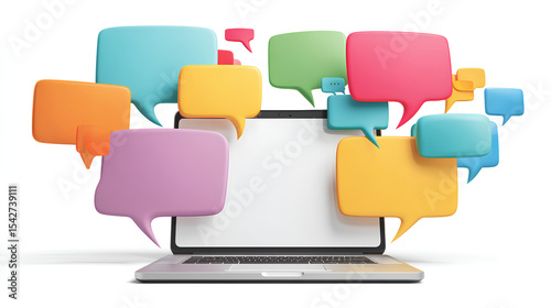 Open laptop with blank screen surrounded by colorful speech bubbles and quote marks, isolated on white background, concept of online chat and communication