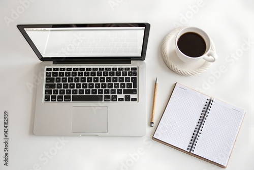 Open laptop with coffee cup and notepad beside, minimalist workspace on white.