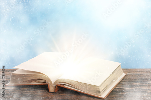Open magic book on table against light background