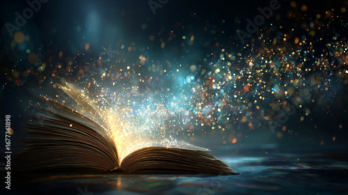 Open Magical Book with Glowing Light and Sparkling Particles Creating a Fantasy Dreamlike Atmosphere on a Dark Enchanted Background